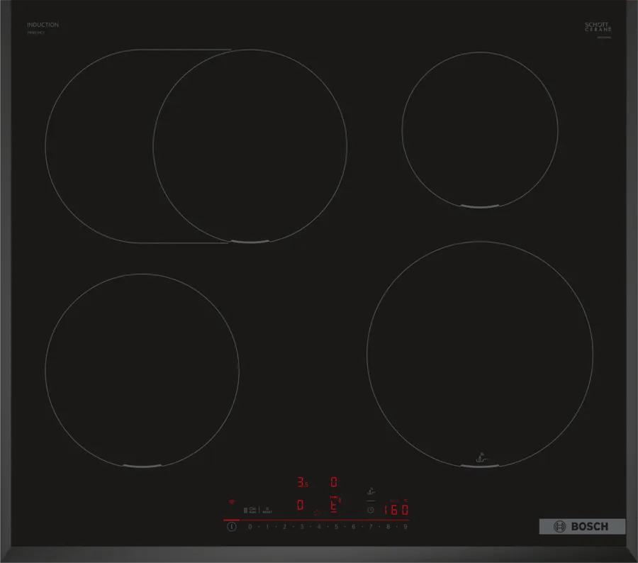 Płyta indukcyjna Bosch PIF651HC1E posiada 4 pola grzewcze z funkcją bridge, umożliwiającą łączenie ich w jedną dużą strefę do gotowania. Wyposażona w interfejs Multitouch+ oraz czujnik smażenia PerfectFry Plus, który pomaga uniknąć przypalenia potraw. Wymaga podłączenia elektrycznego przez specjalistę, ponieważ nie ma wtyczki.