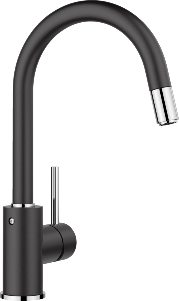 Bateria Blanco MIDA-S Silgranit-Look w kolorze czarnym łączy elegancję z funkcjonalnością. Wyposażona w delikatnie zaokrągloną wylewkę i smukły korpus, idealnie nadaje się do napełniania wysokich garnków i wazonów. Kąt obrotu 360° oraz wyciągana wylewka zwiększają jej praktyczność, co czyni ją doskonałym wyborem do kompaktowych zlewozmywaków.
