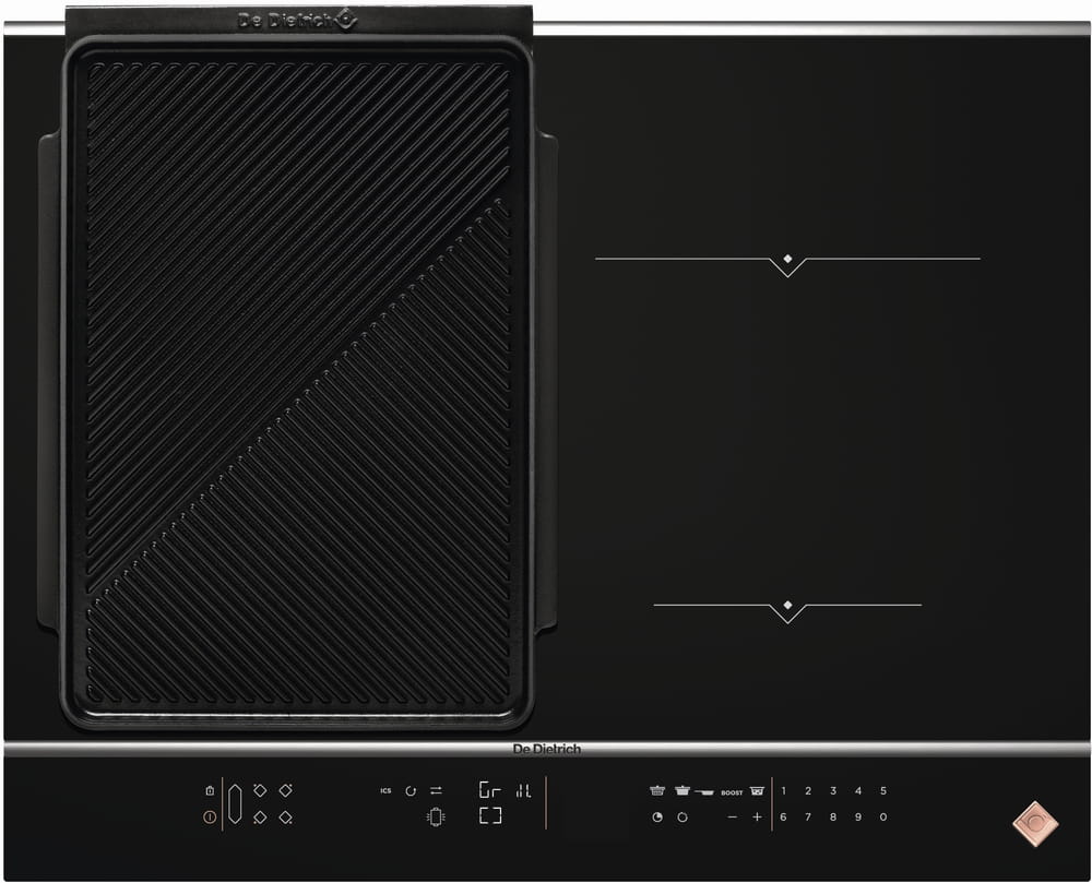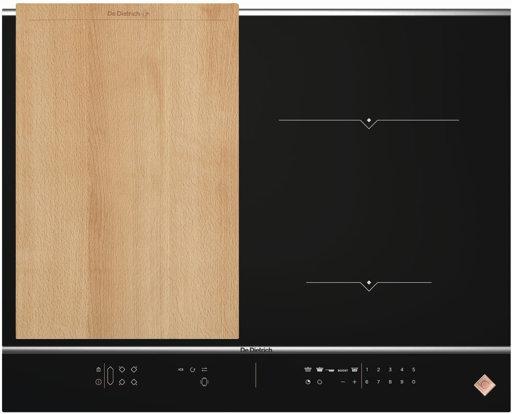 Płyta indukcyjna De Dietrich HORIZONE PLAY 65CM DPI7684XS PLATINUM ma cztery pola grzewcze, z czego dwa można połączyć w jedną dużą strefę (bridge). Całkowita moc to 7400 W, a funkcja Boost pozwala na szybkie podgrzewanie. Urządzenie oferuje 20 poziomów mocy i 8 funkcji, w tym Boil i Grill. W zestawie znajduje się praktyczna drewniana deska do krojenia.