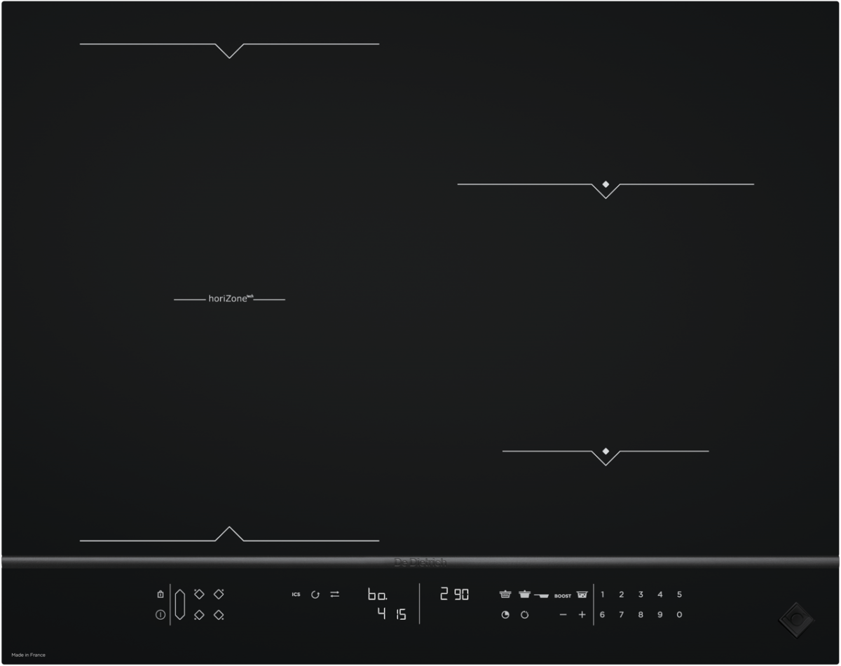 Płyta indukcyjna De Dietrich DPI7686BP o szerokości 65 cm z czarnego szkła i ozdobną listwą ze stali nierdzewnej. Posiada 4 strefy grzejne, w tym dwie połączone w jedną dużą strefę (bridge – łączenie pól grzejnych w jedną strefę). Całkowity pobór mocy wynosi 7400 W. Intuicyjna obsługa klawiaturą numeryczną, 20 poziomów mocy oraz funkcje Booster i Timer ułatwiają gotowanie.