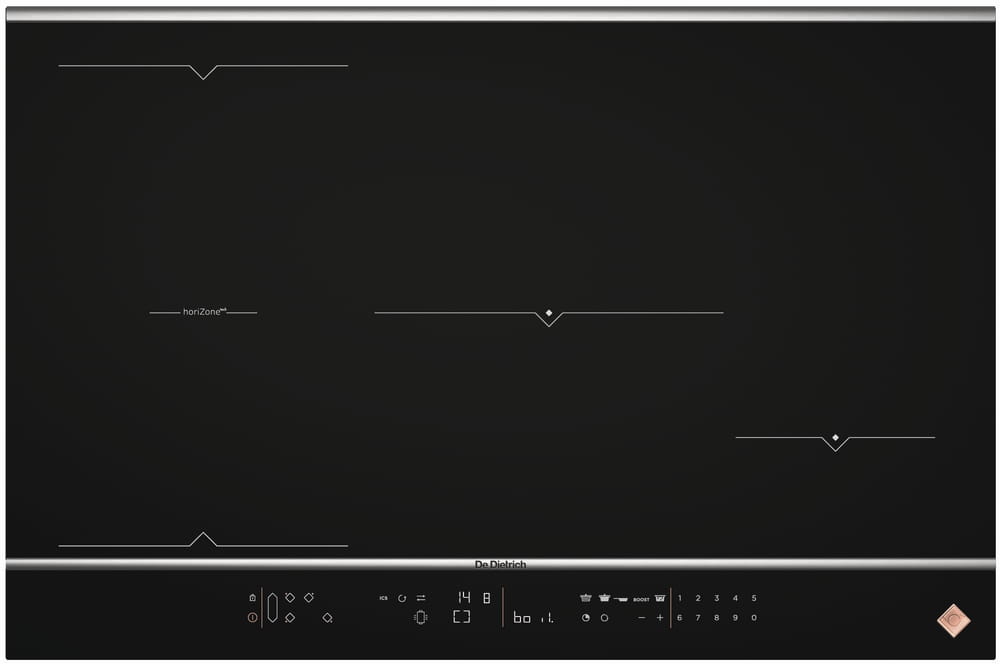 Płyta indukcyjna De Dietrich HORIZONE PLAY 80CM DPI7884XS Platinum ma 4 pola grzewcze, z czego 2 można połączyć w jedną strefę (bridge – łączenie pól grzejnych w jedną strefę). Wyposażona jest w automatyczne wykrywanie naczyń, 20 poziomów mocy oraz funkcje Booster i Timer dla szybkiego podgrzewania i wygodnego planowania gotowania. W zestawie znajduje się praktyczna drewniana deska do krojenia.