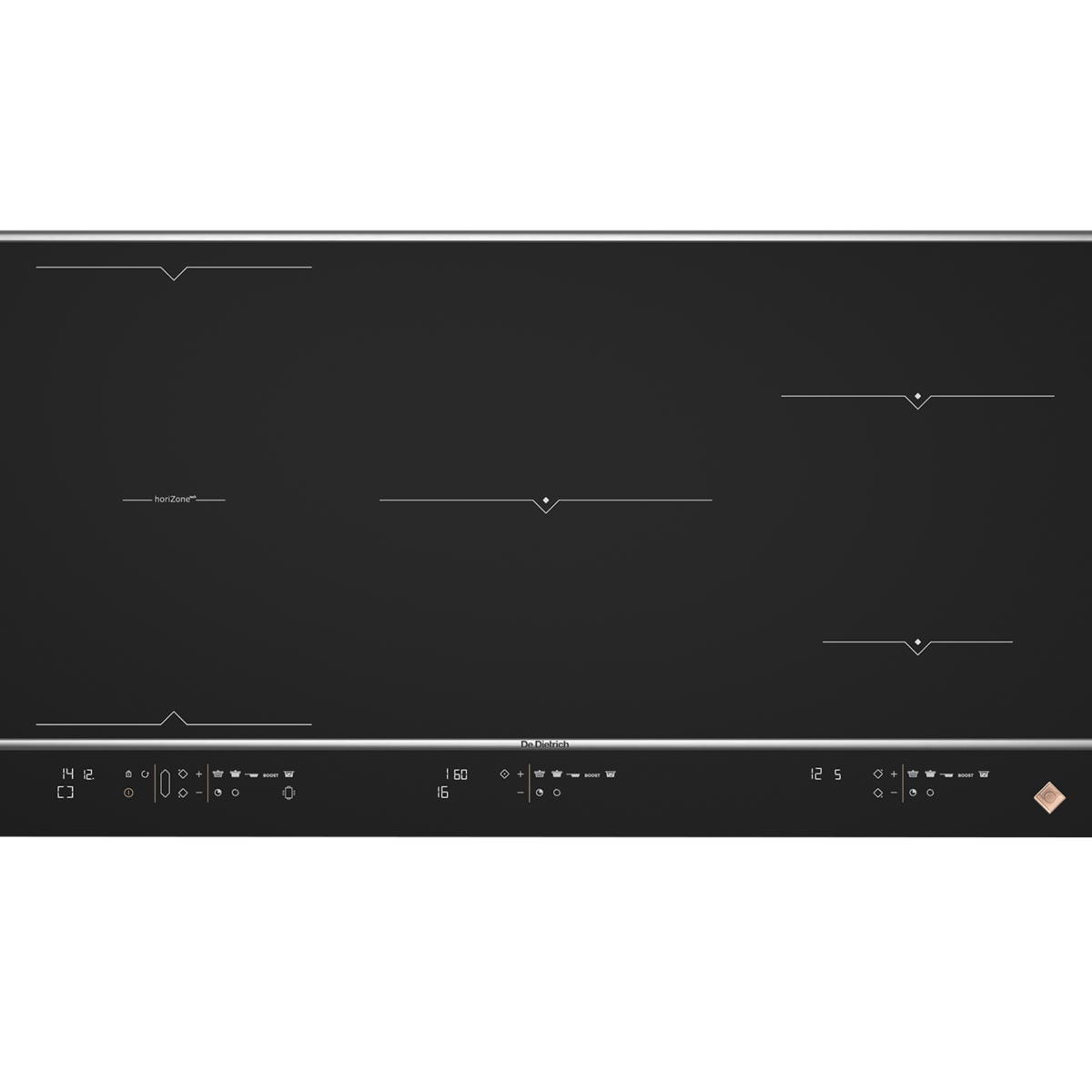 Płyta indukcyjna De Dietrich HORIZONE 90 CM DPI7966XS PLATINUM ma 5 niezależnych pól grzewczych i funkcję bridge, która pozwala łączyć pola w jedną strefę. Wyposażona jest w automatyczne wykrywanie naczyń, 20 poziomów mocy oraz całkowitą moc 11 100 W, co zapewnia szybkie i precyzyjne gotowanie. W zestawie znajduje się praktyczna drewniana deska do krojenia. Kompaktowe wymiary 90x6x49 cm ułatwiają dopasowanie do różnych kuchni.