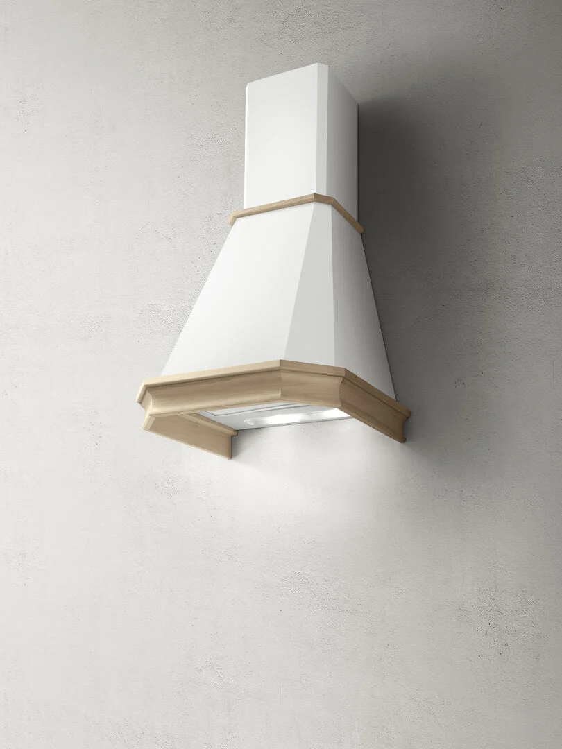 Okap Elica EMERALD WH/A/90 łączy białe wykończenie z surowym drewnem tulipanowca. Wyposażony w oświetlenie LED 2 x 3 W oraz 3-stopniowe sterowanie suwakiem. Pracuje z poziomem hałasu 56–65 dB i pobiera 146 W mocy. W zestawie znajduje się aluminiowy filtr przeciwtłuszczowy oraz komin.