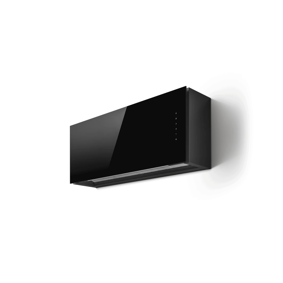 Okap Elica RULES NAKED/F/90 to model w czarnym szkle i Dektonie, dostępny w szerokościach 60, 90 i 120 cm. Umożliwia personalizację frontu meblowego i wyposażony jest w opatentowane ukośne filtry przeciwtłuszczowe, które skutecznie zbierają skropliny. Posiada oświetlenie LED oraz dotykowe sterowanie, a jego praca jest cicha, z poziomem hałasu od 40 do 58 dB.