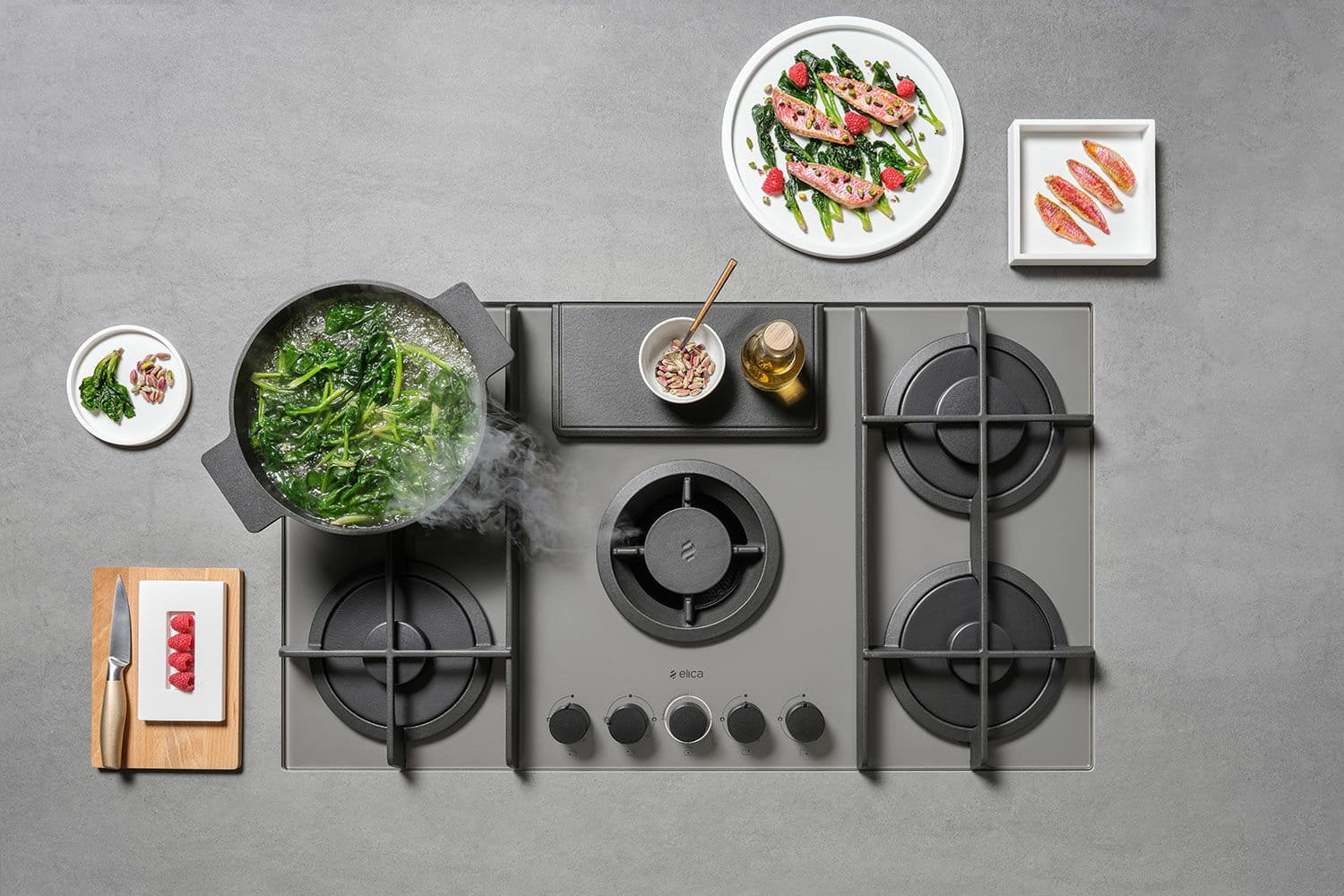 Okap Elica NIKOLATESLA FLAME BL/A/88 to innowacyjne połączenie płyty gazowej z okapem, wykonane z czarnego i szarego szkła oraz żeliwa. Wyposażony w aluminiowy filtr przeciwtłuszczowy oraz ceramiczny filtr zapachowy z funkcją regeneracji, zapewnia skuteczne pochłanianie zapachów z prędkością 5,1 m/s. Pracuje cicho, z poziomem hałasu od 45 do 63 dB(A), oferując stabilność garnków dzięki płaskim rusztom żeliwnym.
