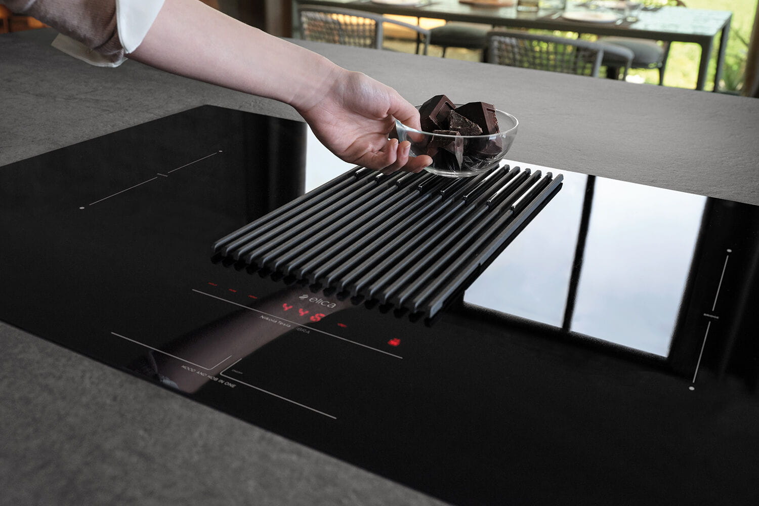 Płyta z okapem NIKOLATESLA LIBRA BL/A/83 marki Elica łączy płytę indukcyjną ze zintegrowaną wagą i okapem. Wykonana z czarnego szkła i żeliwa, wyróżnia się centralną kratką oraz intuicyjnym sterowaniem dotykowym typu Slider. Prędkość pochłaniania wynosi 5,1 m/s, a urządzenie może pracować jako wyciąg lub pochłaniacz. W zestawie znajdują się aluminiowy filtr przeciwtłuszczowy oraz ceramiczny filtr zapachowy z funkcją regeneracji.