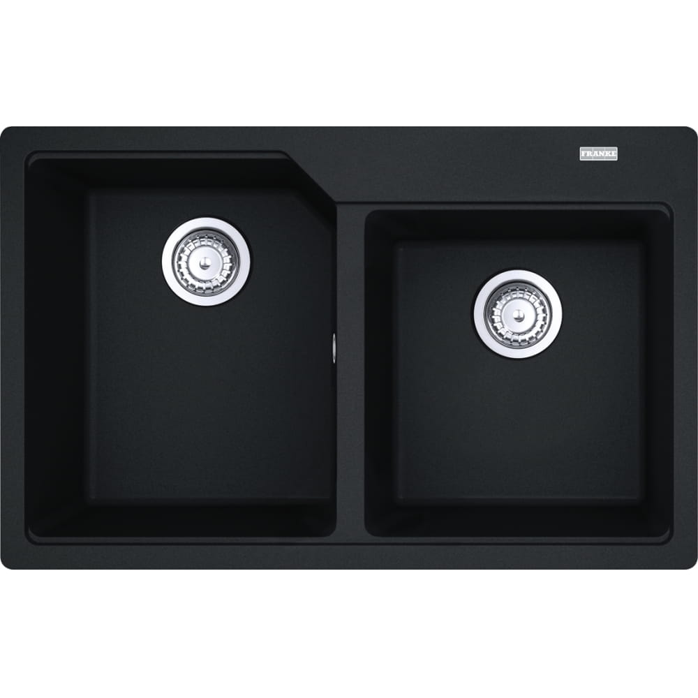 Zlew Franke Fragranit+ Urba UBG 620-36-33 Onyx wykonany z trwałego materiału Fragranite, z dwiema komorami o wymiarach 359x425 mm (głębokość 220 mm) i 333x364 mm (głębokość 200 mm). Model wbudowywany, bez ociekacza, z odpływem zatyczkowym i syfonem w zestawie. Przeznaczony do szafek o minimalnej szerokości 80 cm.