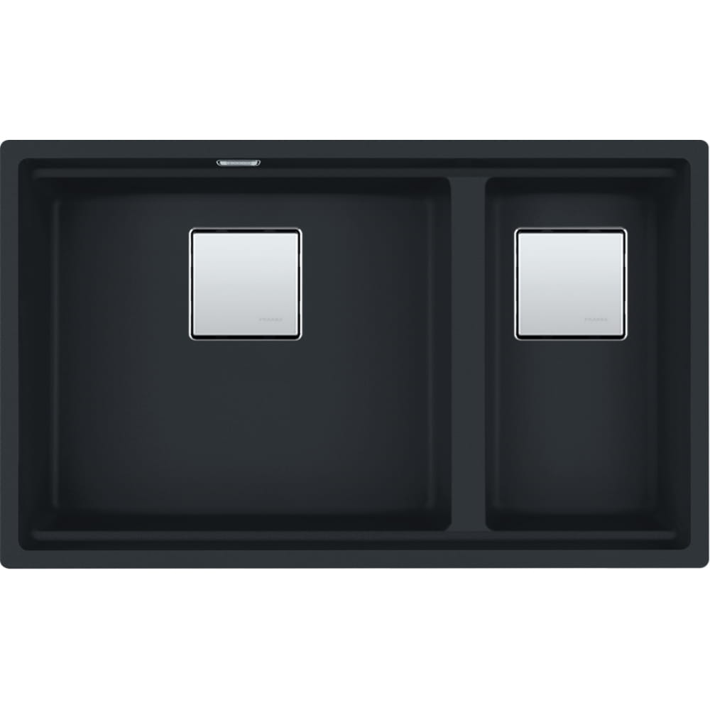 Zlew Franke Kanon KNG 120 w kolorze czarny mat ma wymiary 760 x 460 mm i dwie komory o wymiarach 460 x 420 x 200 mm oraz 210 x 420 x 200 mm. Wyposażony jest w automatyczny korek Flow Pro sterowany przyciskiem Easy Click ze stali szlachetnej. W zestawie znajdują się osłony odpływu.