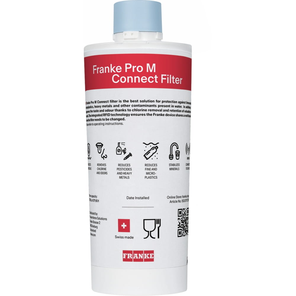 Filtr wymienny Pro M Connect Franke skutecznie zapobiega powstawaniu kamienia, redukuje chlor oraz usuwa pestycydy, metale ciężkie i mikroplastik, poprawiając smak i zapach wody. Stabilizuje korzystne minerały, a technologia RFID informuje o konieczności wymiany filtra, zapewniając stałą skuteczność działania.