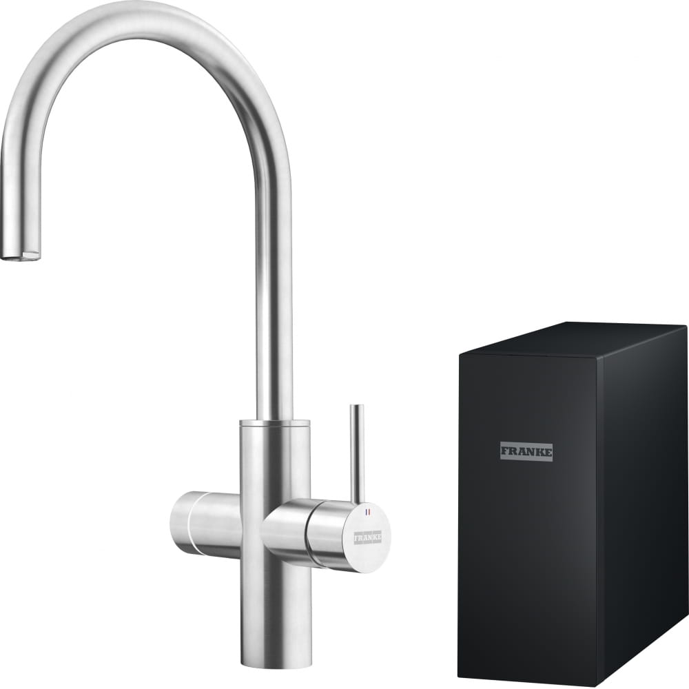Bateria kuchenna Mythos Water Hub All in One Franke to system 6w1 zapewniający wodę zimną, ciepłą, filtrowaną, gazowaną, schłodzoną i wrzącą. Kompaktowa obudowa z bojlerem, agregatem chłodniczym, butlą CO2 i filtrem umożliwia łatwy montaż pod zlewem. Elektroniczne sterowanie z LED i aplikacja mobilna ułatwiają obsługę. Filtr Pro M Connect skutecznie usuwa zanieczyszczenia, a stalowa bateria posiada trwałą głowicę ceramiczną.