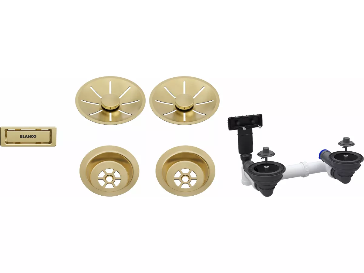 Blanco Armatura odpływowo-przelewowa 2x3,5" z InFino i elementami stalowymi w kolorze satin gold to eleganckie i funkcjonalne rozwiązanie do Twojej kuchni. Wyróżnia się nowoczesnym designem i wysoką jakością wykonania, idealnie komponując się z innymi elementami wyposażenia kuchennego.