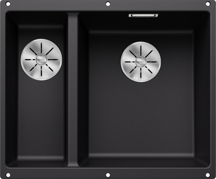 Blanco Subline 340/160-U Silgranit PuraDur to czarna, podwieszana komora kuchenna z trwałego materiału. Posiada dwie komory w jednym otworze, co zwiększa funkcjonalność. Wyposażona w zakryty przelew C-overflow i system odpływowy InFino, co ułatwia utrzymanie czystości.