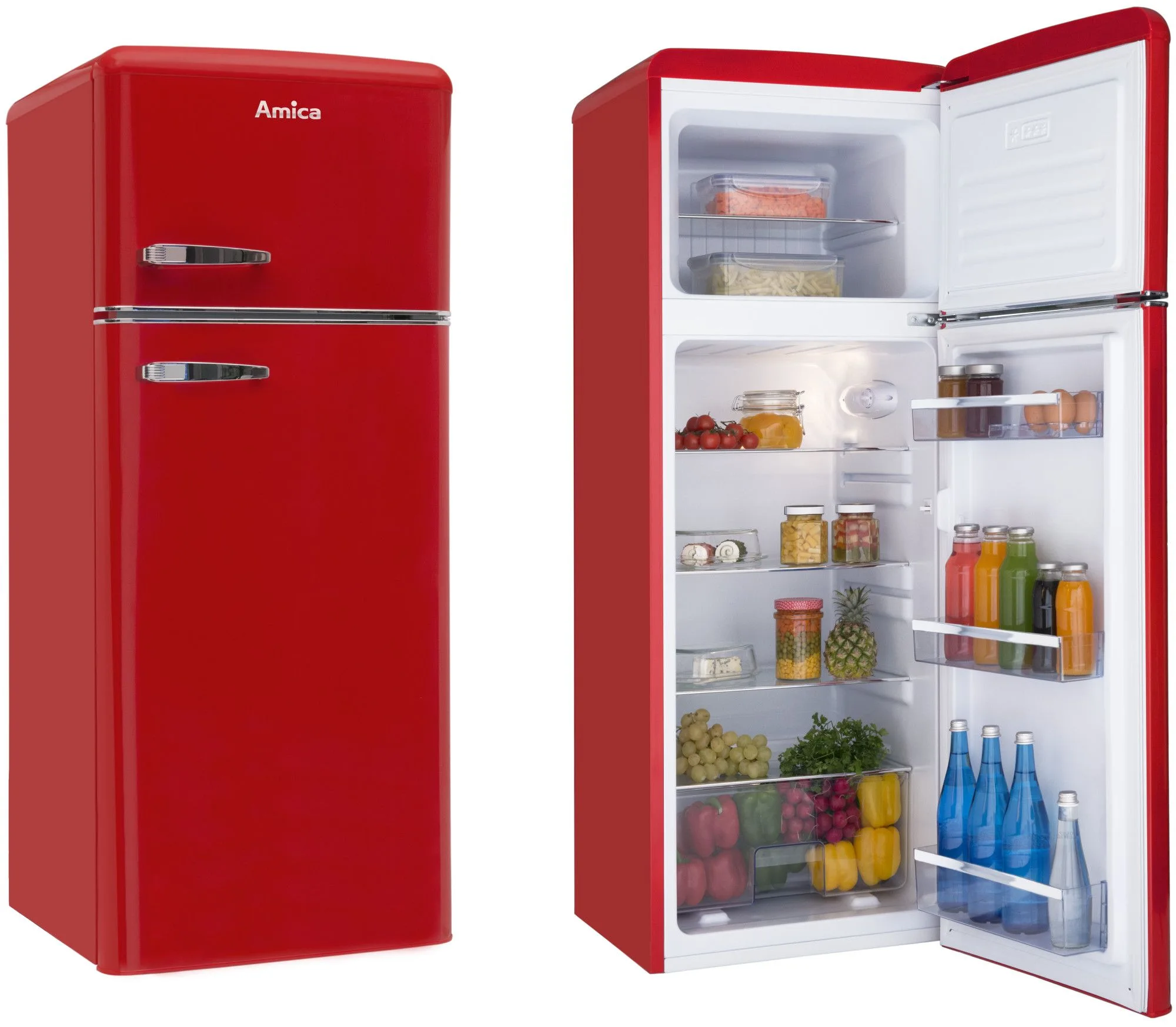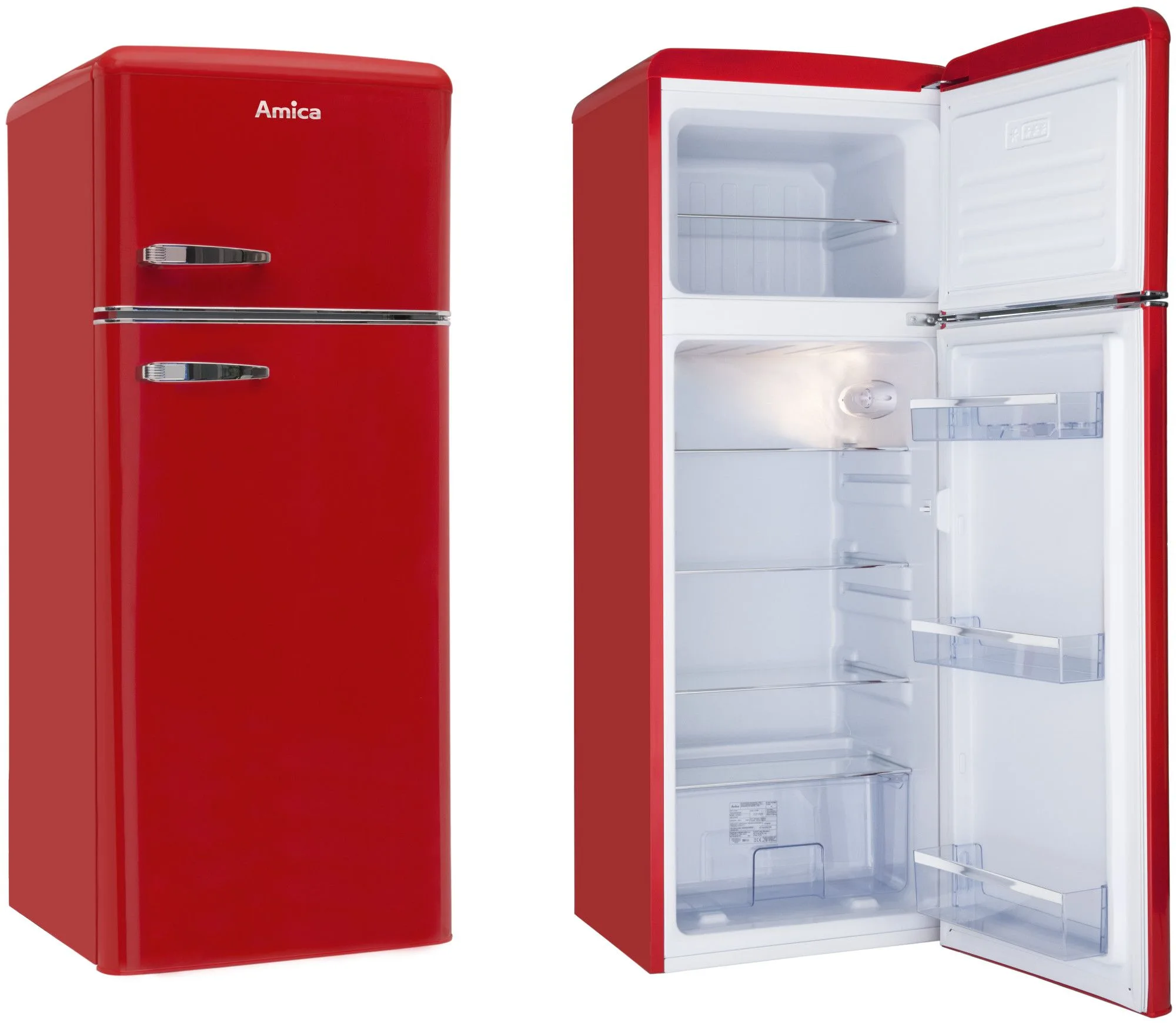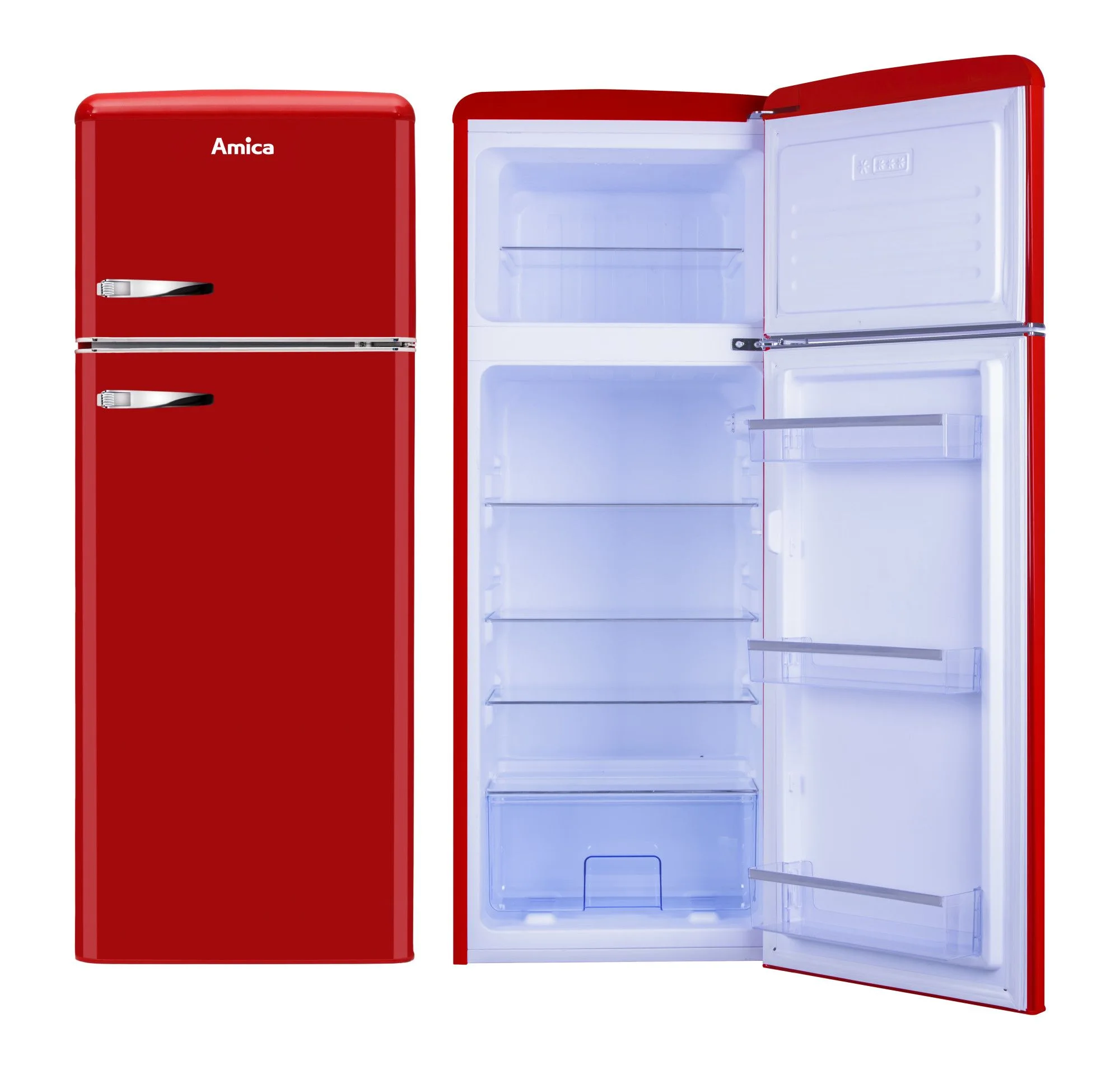 Chłodziarko-zamrażarka Amica KGC15630R z linii Retro oferuje łączną pojemność 208 litrów, z czego 162 litry przypadają na chłodziarkę, a 44 litry na zamrażarkę. Urządzenie pracuje cicho na poziomie 41 dB i posiada klasę energetyczną E. Wyposażone jest w automatyczne odszranianie, oświetlenie LED oraz półki z wytrzymałego szkła SafetyGlass. Dodatkowo, czerwony design i pojemnik na warzywa i owoce zwiększają jego funkcjonalność. Wymiary chłodziarko-zamrażarki to 55 x 144 x 61,5 cm.