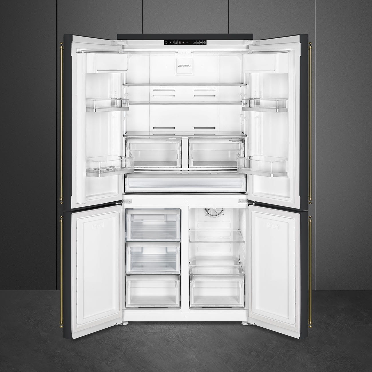 Chłodziarko-zamrażarka Smeg typu "French door" w kolorze antracytowym o pojemności netto 474 litrów i wysokości 187 cm. Wyposażona w system No-Frost, który zapobiega osadzaniu się lodu. Komora Life Plus (0°C) oraz dynamiczna cyrkulacja powietrza MultiFlow zapewniają optymalne warunki przechowywania żywności. Oświetlenie LED ułatwia korzystanie z wnętrza. Uchwyt należy zamówić osobno.