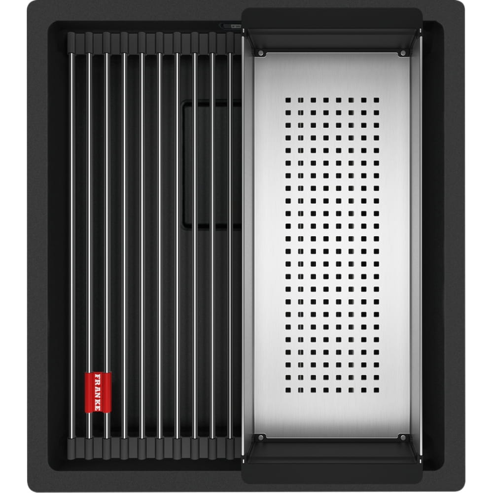 Zlewozmywak Franke Kanon KNG 110-37 w czarnym macie wykonany z trwałego Fragranitu, odpornego na zarysowania i zaplamienia. Posiada głęboką komorę o wymiarach 370x420 mm oraz automatyczny odpływ Flow Pro 3 1/2" sterowany przyciskiem Easy Click. Montaż podbudowany, bez ociekacza, z ukrytym przelewem. Minimalna szerokość szafki to 45 cm.