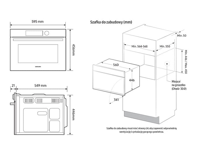 Kuchenka mikrofalowa Samsung NQ5B5713GBK to urządzenie do zabudowy o pojemności 50 L i mocy 900 W. Wyposażona w 15 programów automatycznych oraz funkcję parowego czyszczenia, co ułatwia utrzymanie czystości. Posiada dotykowe sterowanie, blokadę rodzicielską i timer. Wymiary zewnętrzne wynoszą 595 x 456 x 570 mm, a waga netto to 34,3 kg. Kompatybilna z aplikacją SmartThings, co umożliwia zdalne sterowanie.