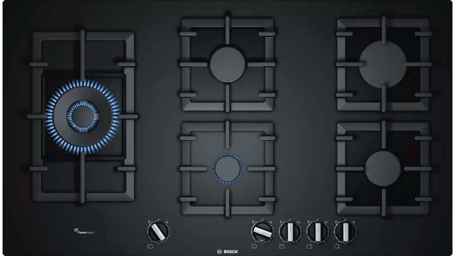 Płyta gazowa Bosch PPS9A6B90 z serii 6 ma 5 palników, w tym palnik Wok, oraz technologię FlameSelect umożliwiającą precyzyjną regulację płomienia. Wyposażona w zabezpieczenie przeciwwypływowe gazu oraz zapalarkę dla większego bezpieczeństwa i wygody. Płyta ma 5 żeliwnych rusztów i szerokość 91 cm, obsługuje gazy 2E i 3B/P.