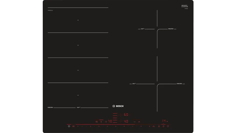 Płyta indukcyjna Bosch PXE601DC1E z serii 8 oferuje elastyczną strefę FlexInduction oraz sensory smażenia dla wygodnego gotowania. Wyposażona w funkcję Booster, timer, MoveMode Plus i podtrzymywanie ciepła. Sterowanie sensorowe DirectSelect Premium oraz elektroniczne rozpoznawanie naczyń ułatwiają obsługę. Płyta posiada zabezpieczenia przed dziećmi i wyłącznik bezpieczeństwa.