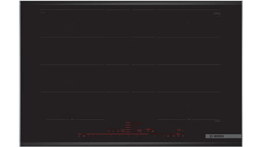 Płyta indukcyjna Bosch Serie 8 PXY875DC1E o szerokości 80 cm z technologią FlexInduction Plus i 2 strefami flex. Wyposażona w sensory smażenia, funkcję Booster, cyfrowy wyświetlacz oraz sterowanie sensorowe DirectSelect Premium. Posiada funkcję podtrzymywania ciepła, zabezpieczenie przed dziećmi i wyłącznik bezpieczeństwa. Do działania wymagane są garnki ze stali ferromagnetycznej.
