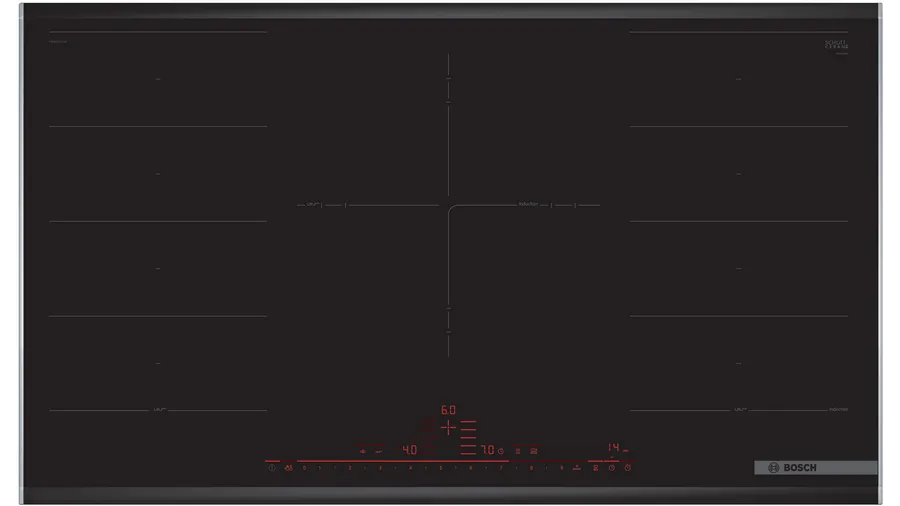 Płyta indukcyjna Bosch Serie 8 PXV975DC1E o szerokości 90 cm posiada 2 strefy flex i 1 potrójną strefę o zmiennym zasięgu. Wyposażona jest w sensory smażenia, elektroniczne rozpoznawanie naczyń, funkcję Booster oraz timer. Sterowanie sensorowe DirectSelect Premium oraz zabezpieczenie przed dziećmi i wskaźnik zalegania ciepła zapewniają wygodę i bezpieczeństwo użytkowania.
