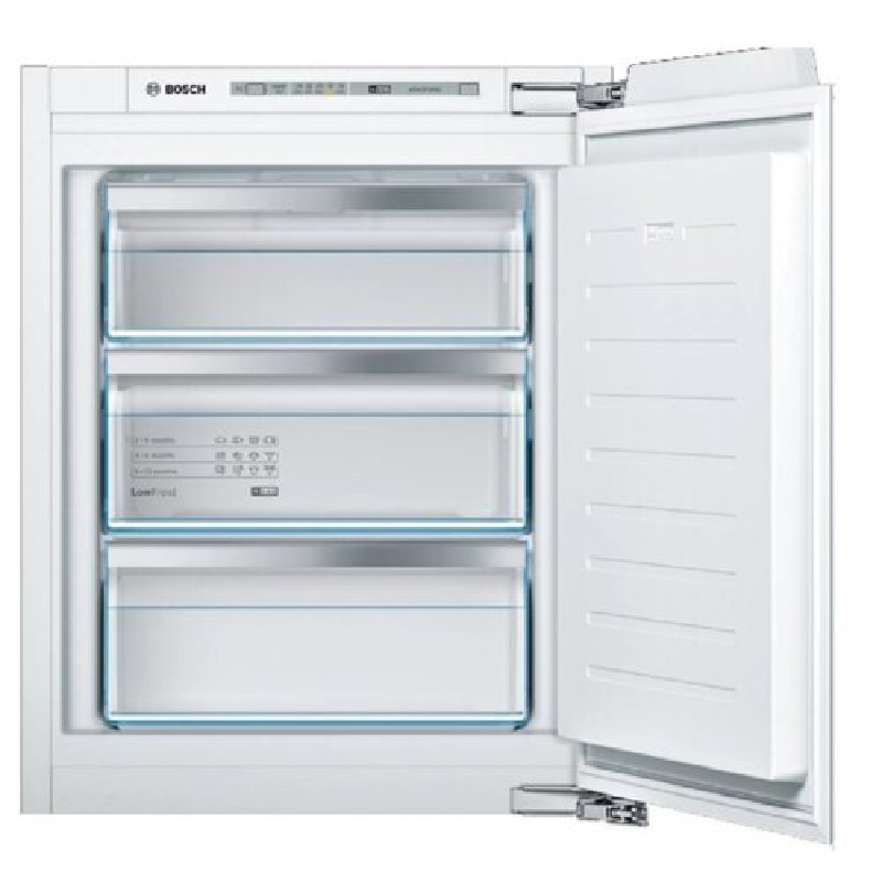 Zamrażarka Bosch GIV 11AFE0 o pojemności 72 litrów wyposażona jest w technologię LowFrost, która ogranicza powstawanie lodu. Urządzenie ma klasę energetyczną E i zużywa 167 kWh rocznie. Zamraża do 4,4 kg żywności na dobę, oferując funkcję supermrożenia. Posiada 3 przezroczyste szuflady oraz elektroniczną regulację temperatury z wyświetlaczem LED.