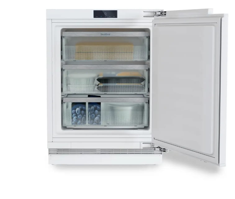 Zamrażarka do zabudowy Liebherr SUFd 3603 o pojemności 87 litrów i kompaktowych wymiarach (82-88 cm wysokości, 60 cm szerokości, 56 cm głębokości) łatwo zmieści się pod blatem. Technologia SmartFrost ogranicza osadzanie się szronu, co ułatwia utrzymanie czystości. Urządzenie pracuje cicho, generując hałas na poziomie 34 dB.