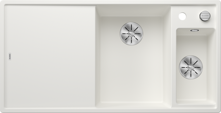 Zlew Blanco AXIA III 6 S z wytrzymałego Silgranitu w kolorze białym to połączenie elegancji i funkcjonalności. Wyposażony w przesuwaną szklaną deskę do krojenia oraz stalową odsączarkę, zwiększa powierzchnię roboczą. System odpływowy InFino i zakryty przelew C-overflow ułatwiają utrzymanie czystości.