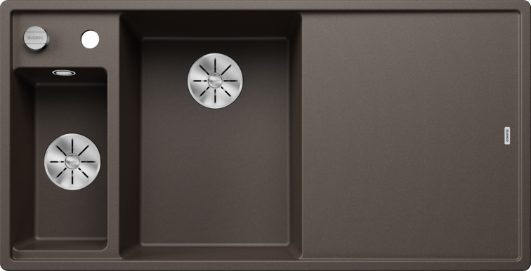 Zlew Blanco AXIA III 6 S w kolorze kawowym z trwałego Silgranitu to idealne rozwiązanie do nowoczesnej kuchni. Wyposażony w przesuwaną szklaną deskę do krojenia oraz stalową odsączarkę, zwiększa funkcjonalność i powierzchnię roboczą. System odpływowy InFino oraz zakryty przelew C-overflow ułatwiają utrzymanie czystości.