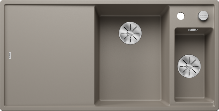 Zlew Blanco AXIA III 6 S Silgranit w kolorze tartufo z prawą komorą oferuje korek automatyczny i system odpływowy InFino. Przesuwana szklana deska do krojenia zwiększa powierzchnię roboczą, a stalowa odsączarka ułatwia przygotowywanie posiłków. Wąski promień zaokrąglenia narożników zapewnia maksymalne wykorzystanie przestrzeni komory.