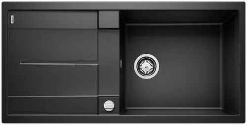 Zlew Blanco METRA XL 6 S Silgranit to elegancki, czarny model z ociekaczem, idealny do szafek o szerokości od 60 cm. Posiada wymiary 100 x 50 cm, głębokość komory 19 cm oraz automatyczny korek. Armatura przelewowo-odpływowa jest w zestawie, ale syfon należy dokupić osobno.