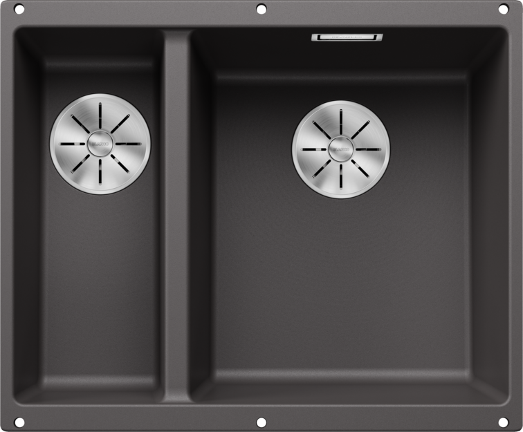Zlew Blanco SUBLINE 340/160-U Silgranit w kolorze szarości skały oferuje dwie komory, co zwiększa wygodę użytkowania. Wyposażony w system odpływowy InFino i zakryty przelew C-overflow, ułatwia utrzymanie czystości. Jego elegancki i prosty design doskonale pasuje do różnych aranżacji kuchennych.