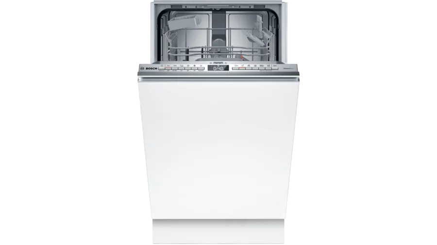 Zmywarka Bosch SPH4EKX24E o szerokości 45 cm mieści 10 kompletów naczyń i oferuje 6 programów mycia, w tym Eco 50°C i Garnki 70°C. Posiada funkcję Home Connect do zdalnego sterowania. Klasa energetyczna C, niski poziom hałasu 44 dB oraz zużycie wody 8,9 l na cykl zapewniają oszczędność i wygodę.