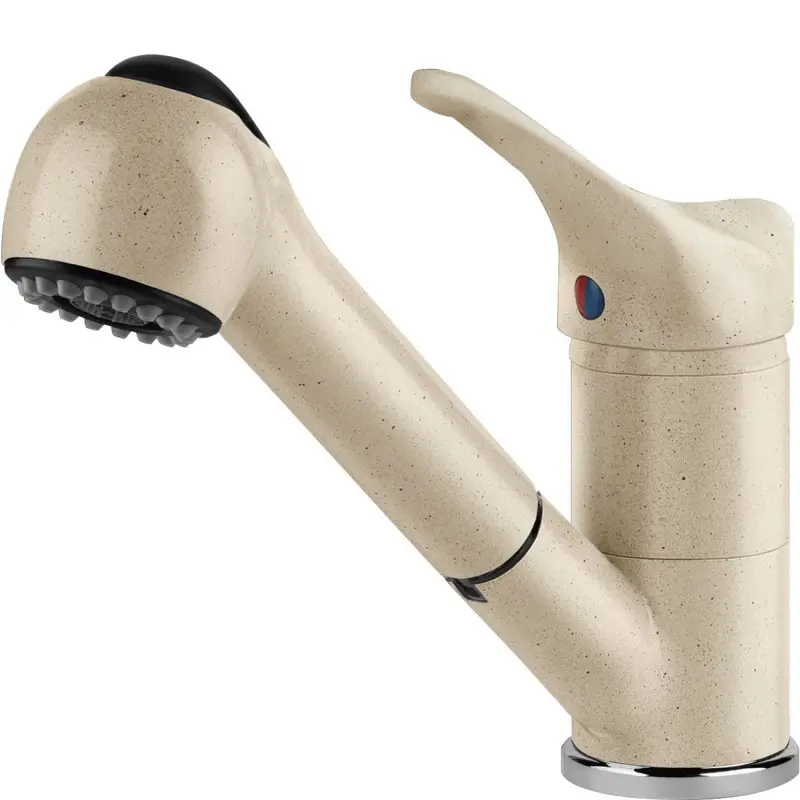 Bateria kuchenna Smeg MD10AV3 Owsiany wyposażona jest w wyciąganą wylewkę z perlatorem natrysku oraz dwie funkcje wylewki. Obrót wylewki o 120° ułatwia codzienne użytkowanie. Pojedynczy uchwyt zapewnia wygodną obsługę.