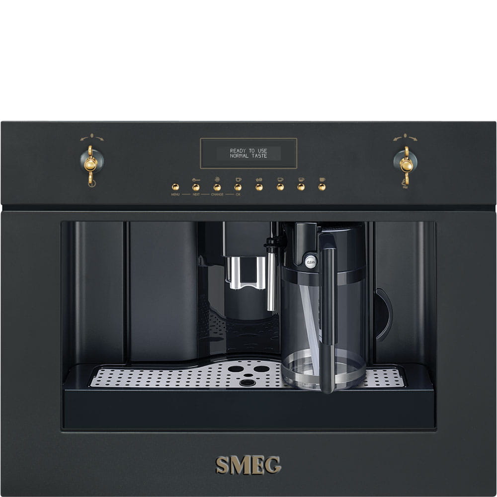Ekspres do kawy Smeg CMS8451A o wysokości 45 cm umożliwia automatyczne przygotowanie cappuccino dzięki oddzielnemu zbiornikowi na mleko. Oferuje 3 poziomy ilości kawy oraz 5-stopniową regulację mocy, co pozwala na dostosowanie napoju do indywidualnych preferencji. Posiada pojemnik na wodę o pojemności 1,8 l oraz możliwość jednoczesnego parzenia 2 filiżanek kawy.