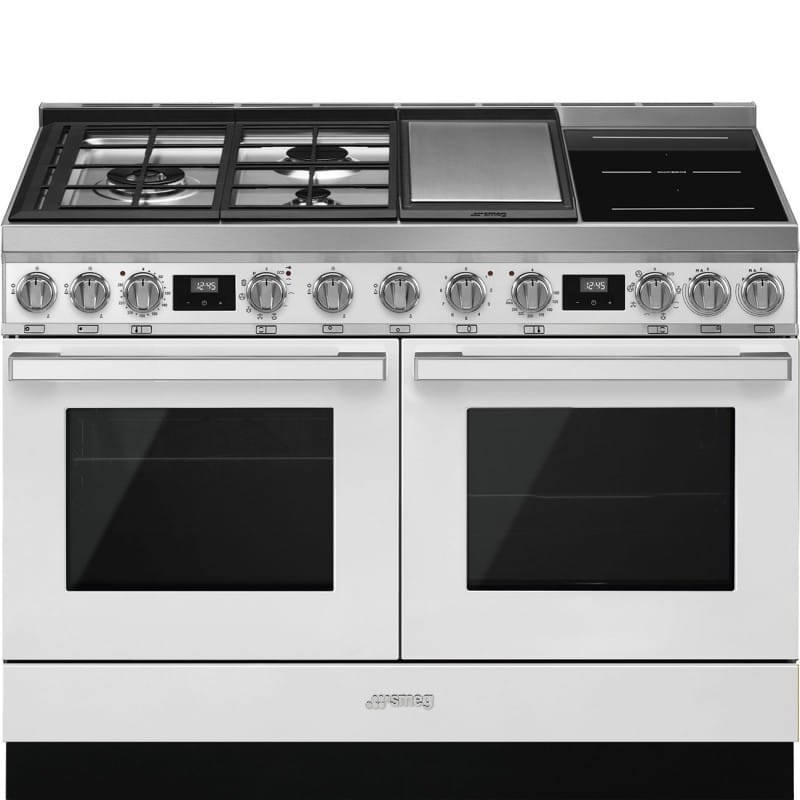Kuchnia wolnostojąca Smeg CPF120IGMPWH Portofino wyposażona jest w dwa piekarniki z termoobiegiem i technologią Direct Steam dla równomiernego pieczenia. Płyta posiada sześć stref grzejnych z funkcją bridge, która pozwala łączyć pola grzejne w jedną strefę. Czyszczenie piekarników ułatwia piroliza, czyli wypalanie brudu w temperaturze około 500°C. Urządzenie ma biały kolor i żeliwne ruszty.