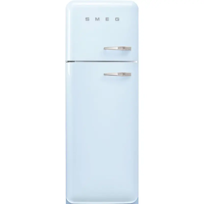 Lodówka wolnostojąca SMEG FAB30LPB5 w pastelowym błękicie o wysokości 172 cm i pojemności brutto 298 litrów. Wyposażona w komorę Life Plus (0°C) oraz dynamiczną cyrkulację powietrza MultiFlow, która zapewnia optymalne warunki przechowywania żywności. Stylowe chromowane uchwyty podkreślają retro design. Drzwi otwierają się na lewą stronę, bez możliwości zmiany kierunku otwierania.