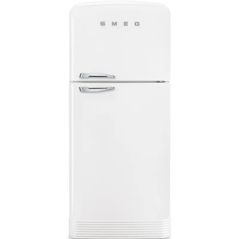 Lodówka wolnostojąca SMEG FAB50RWH5 w stylu retro 50's o pojemności brutto 467 litrów zapewnia dużo miejsca na żywność. Posiada zamrażarkę u góry oraz chromowane uchwyty. Drzwi otwierają się na prawą stronę i nie można zmienić kierunku ich otwierania. Wysokość urządzenia to 187,5 cm.