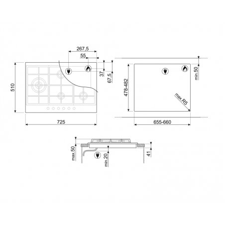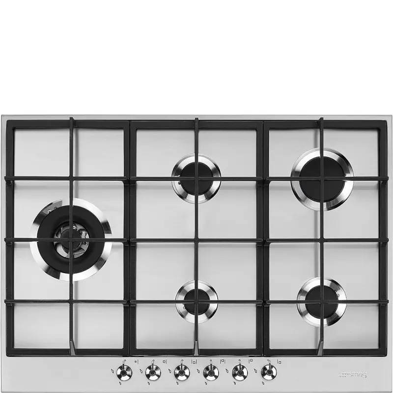 Płyta gazowa Smeg PX375L o szerokości 70 cm wykonana ze satynowanej stali nierdzewnej posiada 5 palników, w tym super szybki o mocy 4,20 kW. Wyposażona jest w żeliwne ruszty zapewniające stabilność naczyń oraz 6 pokręteł do wygodnego sterowania z przodu. Moc przyłączeniowa gazu wynosi 11 500 W, co gwarantuje dużą elastyczność gotowania.