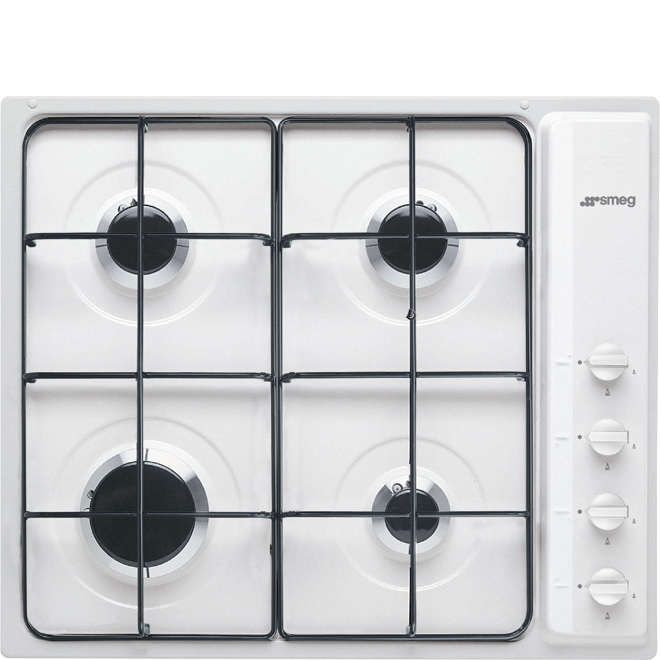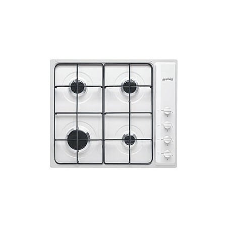 Płyta gazowa Smeg S64SB w kolorze białym o szerokości 58,5 cm wyposażona w 4 palniki i emaliowane ruszty. Posiada zintegrowaną zapalarkę w pokrętle oraz zabezpieczenie przeciwwypływowe gazu dla większego bezpieczeństwa użytkowania.