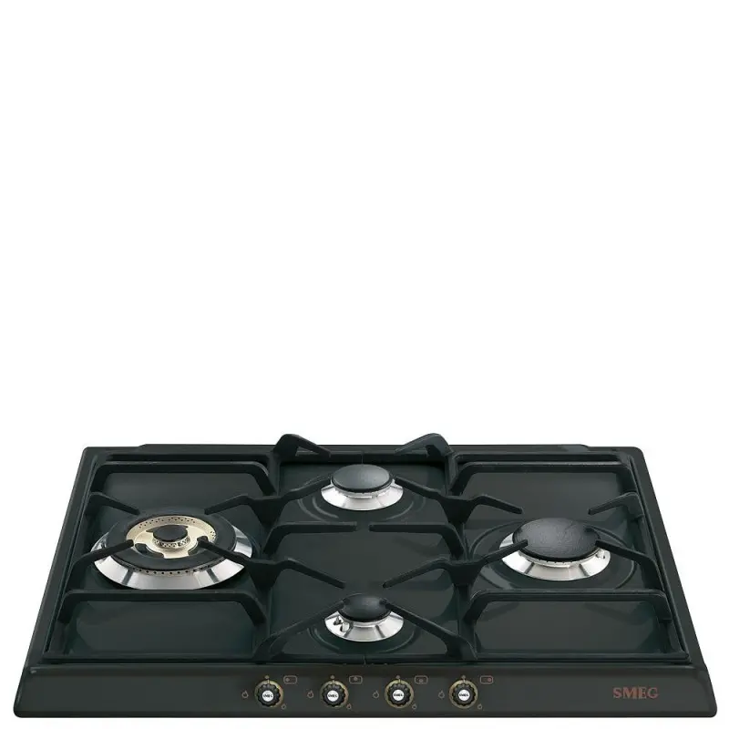 Płyta gazowa Smeg SR764AO o szerokości 60 cm wyposażona jest w 4 palniki i żeliwne ruszty, co zapewnia wygodne gotowanie. Posiada zintegrowaną zapalarkę w pokrętle oraz zabezpieczenie przeciwwypływowe gazu dla większego bezpieczeństwa.