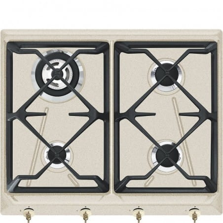 Płyta gazowa Smeg SRV864AVOGH2 w jasnym brązie z mosiężnymi pokrętłami ma 4 palniki i żeliwne ruszty, co zapewnia trwałość i stabilność podczas gotowania. Zintegrowana zapalarka w pokrętle oraz zabezpieczenie przeciwwypływowe gazu zwiększają bezpieczeństwo użytkowania. Szerokość 60 cm sprawia, że płyta pasuje do większości kuchni.